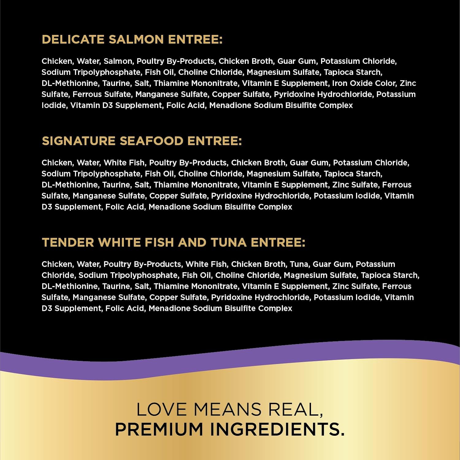 - Variety pack contains three delectably soft cat food entrées with the light texture and irresistible seafood flavor cats love