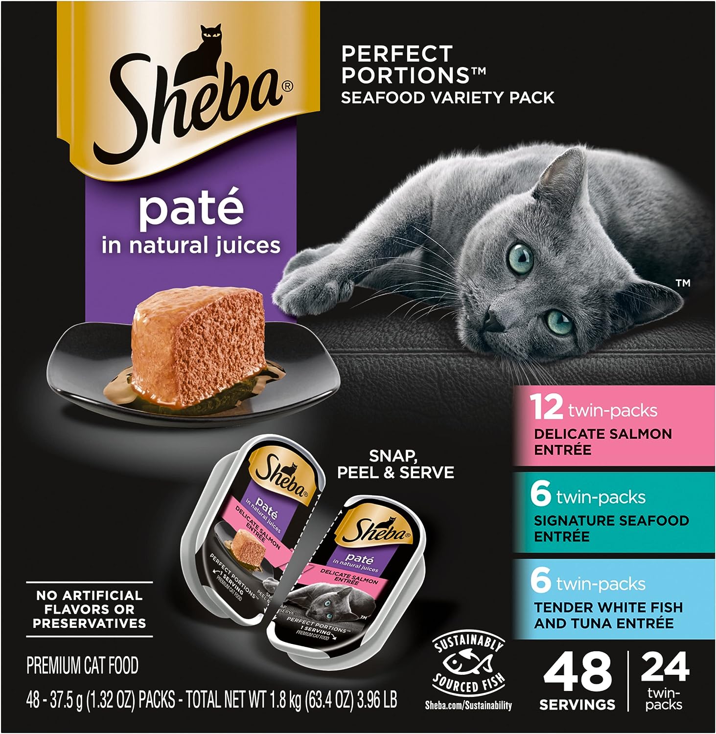 - Contains twenty-four (24) 2.6 oz. twin packs (48 servings total) of SHEBA PERFECT PORTIONS Paté Wet Cat Food Variety Pack: (6) Signature Seafood Entrée, (12) Delicate Salmon Entrée, and (6) Tender Whitefish & Tuna Entrée